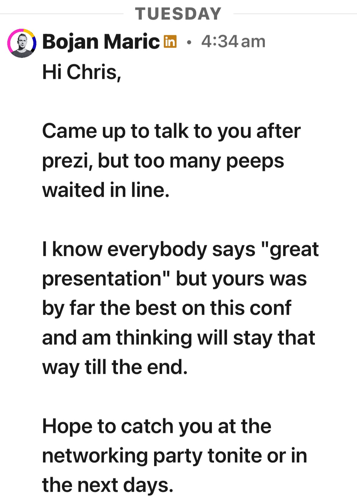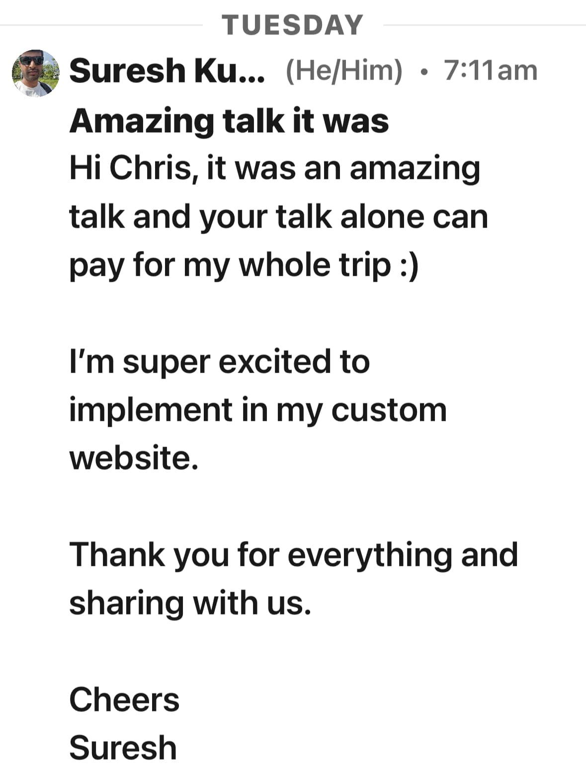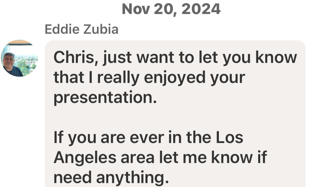 "I'm getting so many texts of folks asking about you 🔥🔥🔥🔥. You are and were a total rockstar on our SXSW panels yesterday!!!! Added SO much insane and clear value! You spoke so well. I’d love to have you back in Scottsdale next year when we do this again!!"