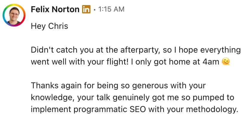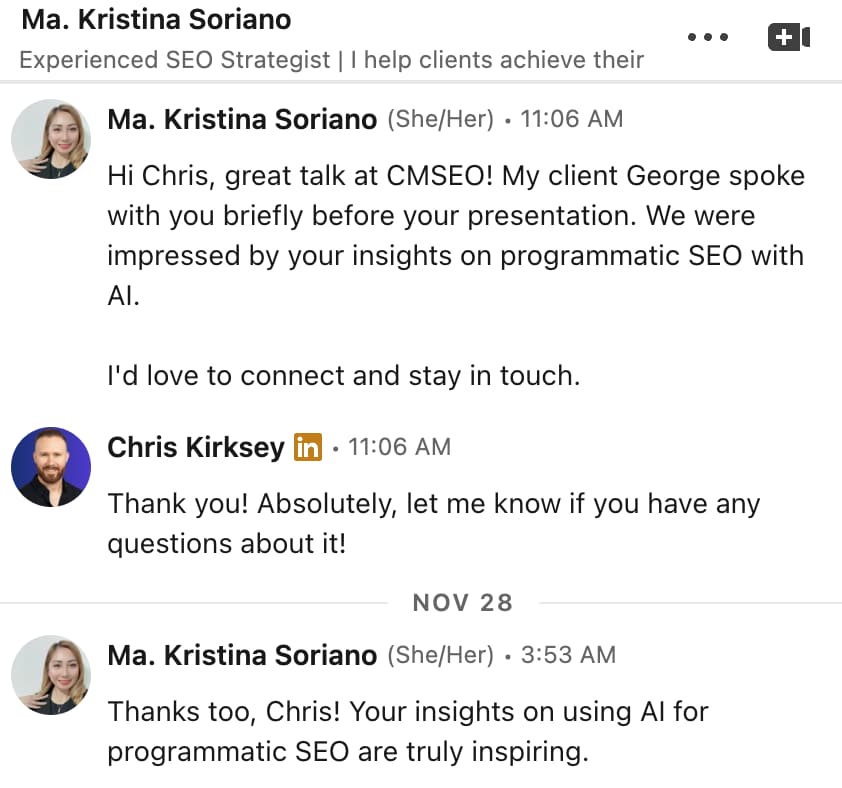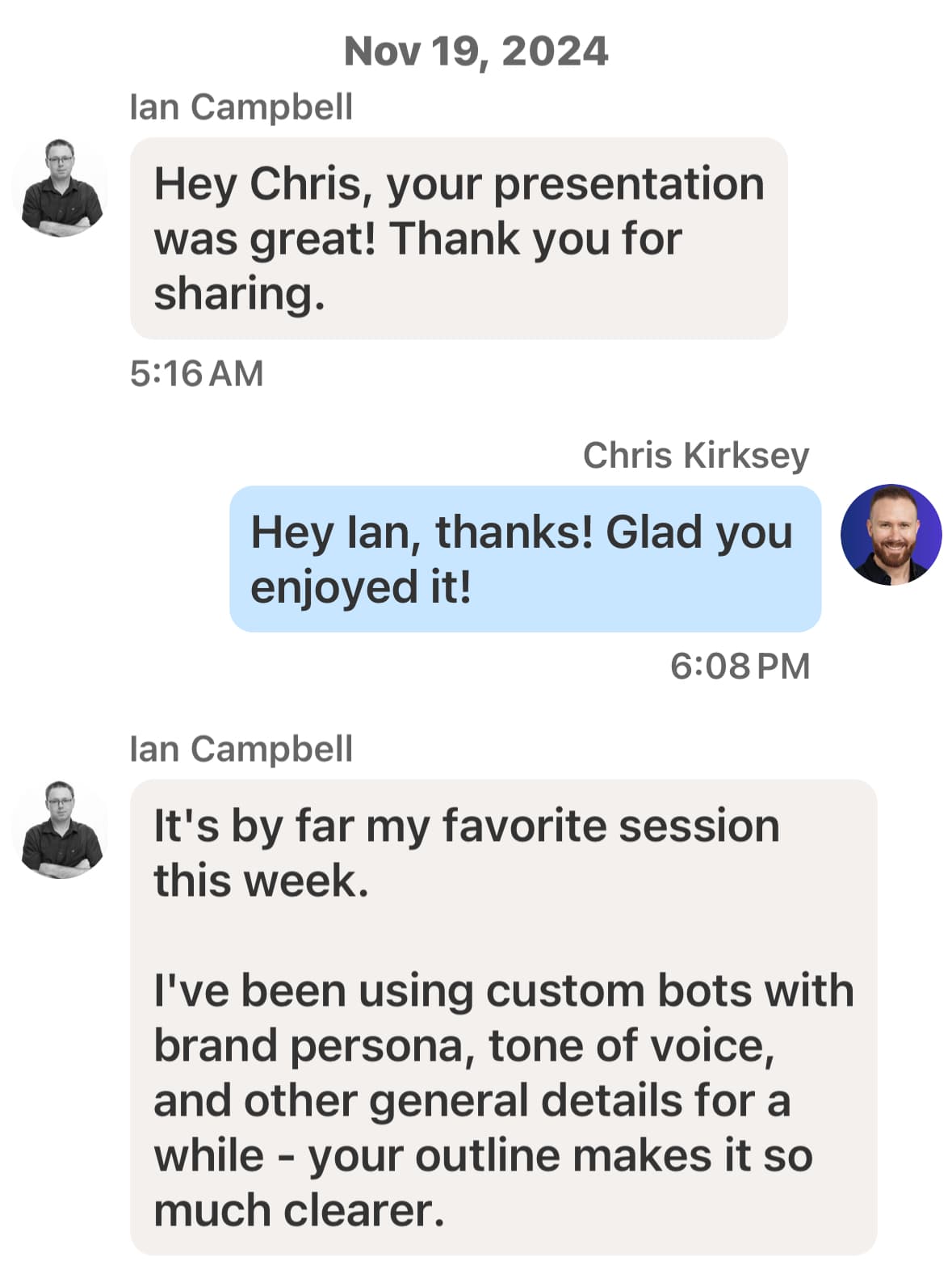 "Chris Kirksey capped the day with an unforgettable session on paradigm shifts in SEO. He shared how he gets websites ranked on the first page within 24 hours, broke down the Eloquence Formula for persuasive writing, and offered actionable tips for optimizing outputs with tools like Claude."