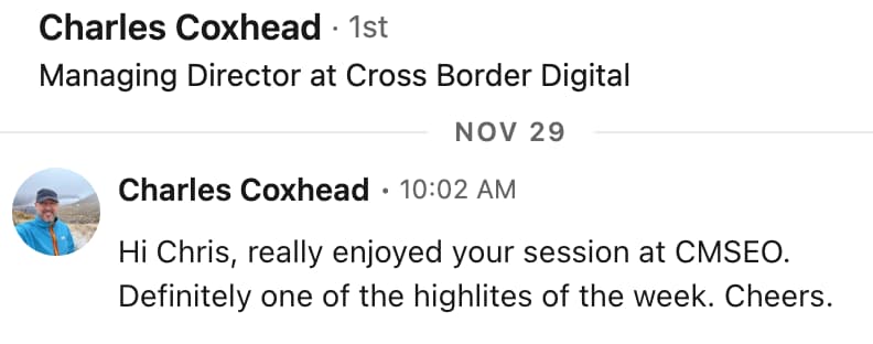Chris will give your audience an engaging, entertaining, and enlightening experience. He has a proven track record of captivating audiences at top-tier conferences such as SXSW , Pubcon, CMSEO, and Entrepreneurs Organization. His ability to break down complex topics, share actionable insights, and address tough questions head-on makes him a favorite among conference-goers.